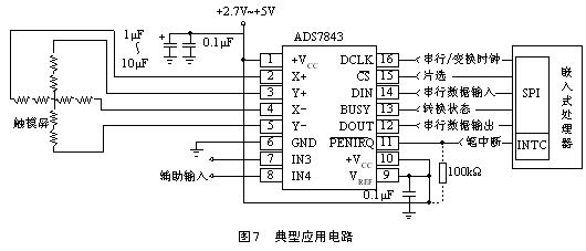 SPI模塊的典型應(yīng)用是:通過(guò)與帶SPI接口的觸摸屏控制芯片連接,提供對(duì)觸摸屏的支持。針對(duì)此目標(biāo),將SPI模塊及其它必要模塊加載到FPGA中進(jìn)行硬件、軟件聯(lián)合調(diào)試,對(duì)實(shí)際電路進(jìn)行驗(yàn)證。我們選用了最常見(jiàn)的四線式電阻式觸摸屏,而觸摸屏控制芯片采用ADS7843。ADS7843是一個(gè)內(nèi)置12位模數(shù)轉(zhuǎn)換、低導(dǎo)通電阻模擬開(kāi)關(guān)的串行接口芯片,支持8和12位的A/D轉(zhuǎn)換精度。為了完成一次電極電壓切換和A/D轉(zhuǎn)換,微處理器需要先通過(guò)SPI接口往ADS7843發(fā)送控制字,轉(zhuǎn)換完成后再通過(guò)SPI接口讀出電壓轉(zhuǎn)換值。標(biāo)準(zhǔn)的一次轉(zhuǎn)換需要24個(gè)時(shí)鐘周期[6]。典型的應(yīng)用電路如圖7所示。