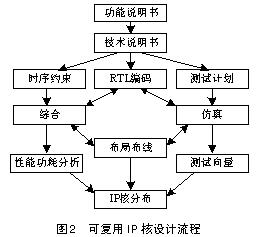 代碼編寫(xiě)規(guī)則和可綜合的書(shū)寫(xiě)規(guī)范是實(shí)現(xiàn)IP核的基礎(chǔ),可保證IP軟核在任何EDA工具下編譯和綜合的正確性。為SoC集成時(shí)消除綜合產(chǎn)生的風(fēng)險(xiǎn),我們制定了Verilog代碼的書(shū)寫(xiě)規(guī)范,并要求有詳細(xì)的注釋,易于他人理解和修改??蓮?fù)用IP設(shè)計(jì)流程如圖2所示[3]。