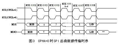 SPI模塊為了和外設(shè)進(jìn)行數(shù)據(jù)交換,根據(jù)外設(shè)工作要求,其輸出串行同步時(shí)鐘極性和相位可以進(jìn)行配置,時(shí)鐘極性(CPOL)對(duì)傳輸協(xié)議沒(méi)有重大的影響。如果CPOL=0,串行同步時(shí)鐘的空閑狀態(tài)為低電平;如果CPOL=1,串行同步時(shí)鐘的空閑狀態(tài)為高電平。時(shí)鐘相位(CPHA)能夠配置用于選擇兩種不同的傳輸協(xié)議之一進(jìn)行數(shù)據(jù)傳輸。如果CPHA=0,在串行同步時(shí)鐘的第一個(gè)跳變沿(上升或下降)數(shù)據(jù)被采樣;如果CPHA=1,在串行同步時(shí)鐘的第二個(gè)跳變沿(上升或下降)數(shù)據(jù)被采樣。SPI主模塊和與之通信的外設(shè)間時(shí)鐘相位和極性應(yīng)該一致。SPI接口時(shí)序如圖3、圖4所示[4]。