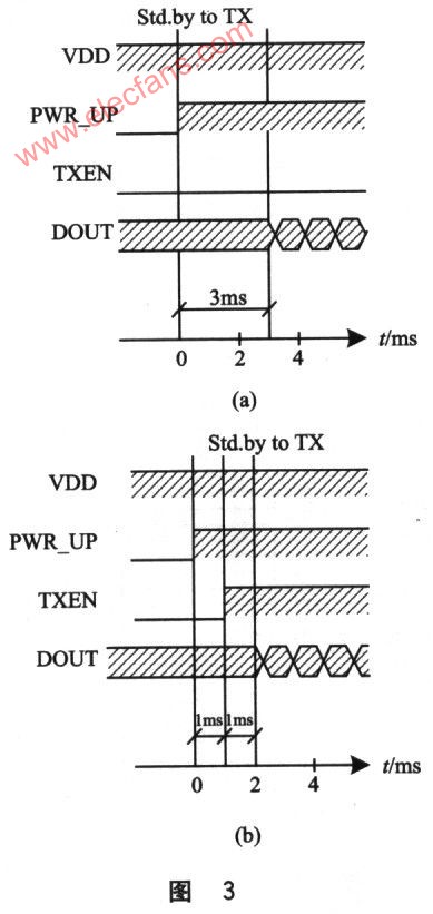 7腳和8腳分別為數(shù)據(jù)輸入腳和輸出腳。配合18腳PWR_UP和19腳TXEN上的電位時(shí)序完成信息的發(fā)送和接收。圖3是進(jìn)行數(shù)據(jù)發(fā)射和接收時(shí)控制各引腳操作時(shí)序圖。