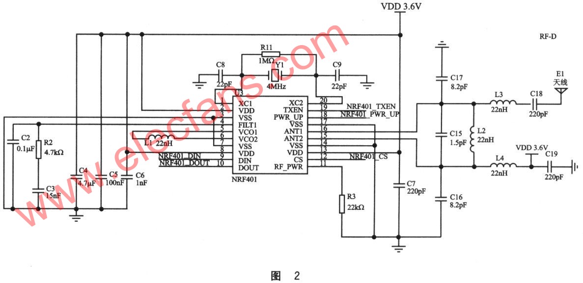 NRF401的ANTl和ANT2是天線的輸入/輸出復(fù)用腳。在輸入模式時(shí),射頻信號通過將該腳連接到低噪音放大器后解調(diào);同樣,在輸出模式時(shí),調(diào)制的信號在功率放大后,通過該腳輸出。