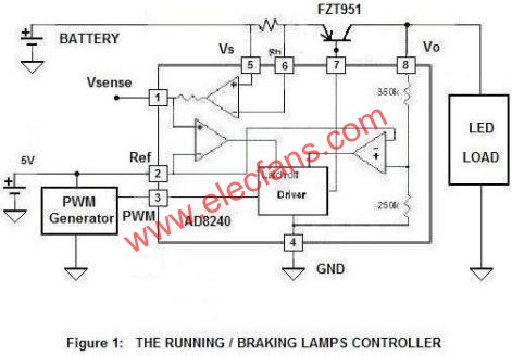 多數(shù)汽車的尾燈和剎車燈采用同一組LED,這就要求LED工作在兩個(gè)不同的亮度等級:剎車時(shí)處于全亮狀態(tài),作