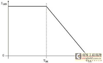 如圖2使用LM3424所示,集成電路將在到達(dá)某溫度時(shí)返送LED電流,此時(shí),LED電流為零。這與LED作為系統(tǒng)中主要熱發(fā)生器的情況不同。對(duì)于大燈組件等應(yīng)用,設(shè)計(jì)師可能想要設(shè)置一項(xiàng)安全功能,即使LED可能在超出安全工作區(qū)的條件下工作,也始終能夠提供光輸出。對(duì)于此類(lèi)情況,LED電流與溫度曲線將如圖4中示例所示。雖然LM3424沒(méi)有這項(xiàng)內(nèi)置功能,但這可以使用外部箝位電路輕松實(shí)現(xiàn),并且防止TSENSE針腳上的電壓低于預(yù)規(guī)定值。