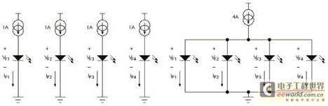 下例顯示了VF變化的影響。在實(shí)驗(yàn)中,使用圖9所示兩種設(shè)置收集數(shù)據(jù)。一種設(shè)置用于4個(gè)LED(每個(gè)LED都具有專(zhuān)門(mén)的電流源),另一種設(shè)置用于并聯(lián)的4個(gè)LED(共享一個(gè)電流源)。表1所示數(shù)據(jù)在25℃加電后5秒內(nèi)測(cè)得,以最大限度降低LED自發(fā)熱的影響。