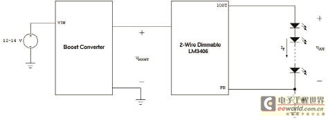 根據(jù)具體的設(shè)計(jì),上述問(wèn)題的影響可能可以忽略。但是,如果系統(tǒng)設(shè)計(jì)師對(duì)上述影響存有顧慮,可以采用單個(gè)串聯(lián)燈組作為首選拓?fù)浣Y(jié)構(gòu)。在這種解決方法中,仍可以使用LM3406等部件,但將增大系統(tǒng)復(fù)雜性,因?yàn)樾枰虑岸瞬考糜趥鬏敵?2V~14V的電源電壓為L(zhǎng)ED驅(qū)動(dòng)器供電。然后,LED驅(qū)動(dòng)器降低此新電壓,為單個(gè)LED燈組供電。這可以通過(guò)在直流電源和LM3406之間增加升壓DC/DC功率級(jí)輕松實(shí)現(xiàn),如圖10所示。通過(guò)此拓?fù)浣Y(jié)構(gòu),串聯(lián)燈組中的所有LED均具有相同的電流,無(wú)論各LED的VF值是多少。
