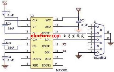 通信接口電路如圖6所示。采用美信的MAX3232芯片,外圍電路非常簡(jiǎn)單,只需要5個(gè)0.1μF的電容器。該電路把單片機(jī)串口輸出信號(hào)隔離變換成 RS-232信號(hào)發(fā)送到汽車總線上,同時(shí)還可以實(shí)現(xiàn)該系統(tǒng)與計(jì)算機(jī)的通信。