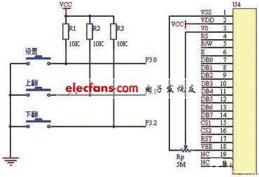 鍵盤和顯示電路如圖7所示,由鍵盤和液晶顯示兩部分組成。其中鍵盤采用獨(dú)立式按鍵,有3個(gè)按鍵,一個(gè)設(shè)置鍵、一個(gè)上翻鍵、一個(gè)下翻鍵??梢赃M(jìn)行報(bào)警值、工作方式、時(shí)鐘等各個(gè)參數(shù)的設(shè)置。液晶顯示電路采用ZJM12864BSBD這款低功耗的點(diǎn)陣圖形式LCD,顯示格式為128點(diǎn)(列)×64點(diǎn)(行),具有多功能指令,容易使用,可實(shí)時(shí)的顯示時(shí)鐘、距離和報(bào)警提示信息,方便直觀。