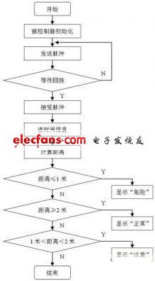 超聲波發(fā)射電路發(fā)出超聲波的同時(shí)計(jì)數(shù)器開始計(jì)數(shù),當(dāng)遇到障礙物反饋信號(hào)到超聲波接收器接收,經(jīng)CX20106接收電路處理后,產(chǎn)生一個(gè)低脈沖,該信號(hào)傳送給單片機(jī)產(chǎn)生中斷,調(diào)用測(cè)距子程序,計(jì)算出測(cè)量距離,調(diào)用顯示子程序,根據(jù)不同的測(cè)量數(shù)值在液晶上顯示距離和報(bào)警。當(dāng)距離大于2m,顯示“安全”和測(cè)量距離,繼續(xù)測(cè)量;當(dāng)距離小于1m時(shí),顯示“危險(xiǎn)”和測(cè)量距離,由P1.2位驅(qū)動(dòng)蜂鳴器報(bào)警;當(dāng)距離小于2m且大于1m時(shí),顯示“注意”和測(cè)量距離。為增強(qiáng)抗干擾能力,系統(tǒng)連續(xù)發(fā)射超聲波測(cè)量三次,從中剔除最大最小值,取中間值計(jì)算出精確的距離。這樣每秒可測(cè)約三個(gè)數(shù)據(jù),仍然可以滿足實(shí)時(shí)性要求。