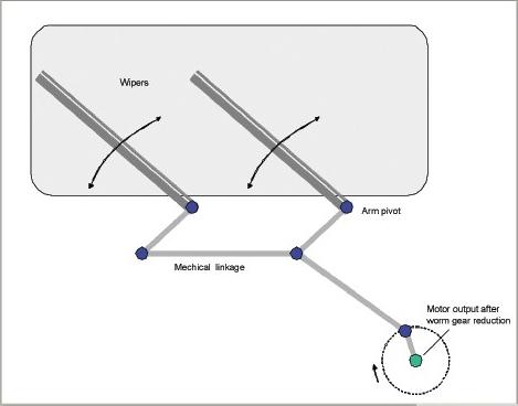 在目前已有的前端雙雨刷系統(tǒng)中,左右雨刷器之間的同步采用機(jī)械連接來實(shí)現(xiàn)(圖1)。這一做法很有必要,因?yàn)閾躏L(fēng)玻璃上的污垢、風(fēng)的影響或雨刷器的狀況都會使左右雨刷器