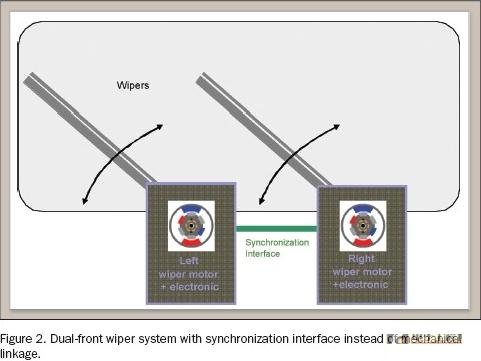 1856 在目前已有的前端雙雨刷系統(tǒng)中,左右雨刷器之間的同步用機(jī)械連接實(shí)現(xiàn)(圖1)。這很有必要,因?yàn)閾躏L(fēng)玻璃受污垢、風(fēng)及雨刷器的狀況不同的影響,使左右雨刷器的狀態(tài)不同。