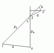 設J為基站位置,U為用戶車載設備位置,基準站與用戶站之間的距離為n,基站至衛(wèi)星的偽距為ρj,用戶至衛(wèi)星的偽距為ρu。設衛(wèi)星實際位置與GPS信號傳播的位置之間的斜距為d,基準站和用戶站的偽距測量誤差分別為δρj 和δρu。由圖可見δρj≠δρu。用基準站偽距差分誤差δρj來修正用戶車載設備的測量值顯然存在無法校準的剩余誤差。其誤差值為: