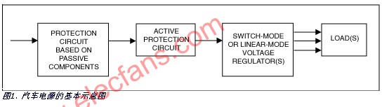 圖1給出了一個(gè)典型的汽車電源簡(jiǎn)化框圖,主要包括以下幾個(gè)單元: