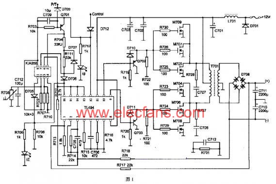 圖1為汽車音響開關(guān)電源電路,該電路主要由兩片集成電路TL494和KIA358、驅(qū)動管Q702和Q703、開關(guān)管M704~M709、變壓器、輸出整流器和濾波器等組成。TL494是一個脈寬調(diào)制型開關(guān)電源集成控制器,其最大驅(qū)動電流為250mA,工作頻率為1~300kHz,輸出方式可選推挽或單端形式。內(nèi)部方框圖如圖2所示,詳細(xì)資料參考 TL494脈寬調(diào)制控制電路。它主要由一個三角波振蕩器、兩個比較器CMP1和CMP2、兩個誤差放大器A1和A2、5V基準(zhǔn)電壓源、觸發(fā)器及輸出驅(qū)動器等組成。