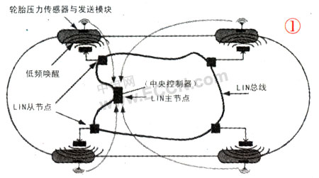 而實(shí)用TPMS示意的輪胎氣壓監(jiān)測(cè)系統(tǒng),是由與輪胎閥一體的4個(gè)訊號(hào)發(fā)射器、收訊天線、收訊器及訊號(hào)顯示儀組成的。為此有必要先對(duì)汽車應(yīng)用的LIN總線有關(guān)技術(shù)作介紹。
