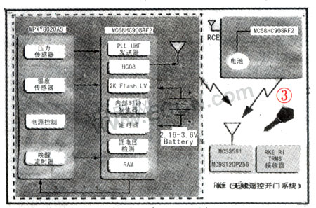 圖3左虛線框內(nèi)為輪胎內(nèi)的壓力傳感器IC和發(fā)送IC。它們是freeseale公司的Mpxy8020A6(或Mpxy8040A)芯片和MC68HC90RF2芯片。Mpxy8020A6它內(nèi)含壓力傳感器、溫度傳感器、電源控制和電池電壓檢測(cè),喚醒功能的定時(shí)器(屬表面微機(jī)械CMOS加工工藝,SSOP封裝);而UHF發(fā)送器+MCU(Flash)的MC68HC90RF2內(nèi)含為2kB用戶FLashROM、定時(shí)器、集成的射頻(Rn發(fā)送器、低壓檢測(cè)和RAM及內(nèi)部時(shí)鐘發(fā)生器。整個(gè)圖3左虛線框?yàn)镸pxy8020A6A與MC68HC90RF2合成的遙測(cè)模塊示意圖。圖3右側(cè)MC33591為UHF接收器,它內(nèi)含鎖相環(huán)(PLL)超高頻開關(guān)鍵控(OOK)接收器;MC912DP256接收端控制器內(nèi)含256kB Flash、12kB RAM、4kB EEP ROM、up to 5CAN、1xJ1850、256MHz工作頻率。