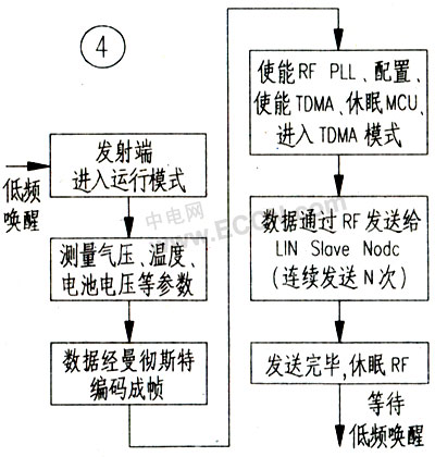 在設(shè)計(jì)一個(gè)運(yùn)行穩(wěn)定、功效高的TPMS系統(tǒng)時(shí)需要考慮的第一個(gè)因素就是軟件。因?yàn)檐囕喣K通常是用微控制器來(lái)執(zhí)行命令的。所以應(yīng)采用一種智能化算法實(shí)現(xiàn)預(yù)期的功效。其次,使用低頻功能是控制TPMS的非常有效的方法。在使用低頻接口時(shí),感應(yīng)模塊可以始終處于電源關(guān)閉模式,只有在收到喚醒信號(hào)后,傳感器才會(huì)進(jìn)行測(cè)量和數(shù)據(jù)傳輸。除了降低功耗以外,低頻接口還具備沒計(jì)靈活性和其他一些優(yōu)勢(shì)。例如,低頻通訊可使系統(tǒng)通過低頻接口向微控制器發(fā)送特定命令。以對(duì)輪胎進(jìn)行重新校準(zhǔn)和定位。在此以MLX90603帶有LF(Low Frequency)接口為例的發(fā)送模塊軟件設(shè)計(jì)方案作一說明。MLX90603帶有LF(LowFrequeney)接口。因此可以在大部分時(shí)間內(nèi)將發(fā)射端處于休眠模式,需要時(shí)通過低頻信號(hào)將其喚醒,進(jìn)而進(jìn)行測(cè)量并通過TH720x發(fā)射芯片將測(cè)量得到的數(shù)據(jù)發(fā)送給相應(yīng)的LIN從節(jié)點(diǎn)。圖4是發(fā)射端的部分流程圖。