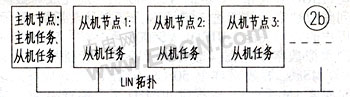 (2)LIN拓?fù)浣Y(jié)構(gòu)。LIN采用單主機(jī)、多從機(jī)模式,一個(gè)LIN網(wǎng)絡(luò)包括一個(gè)主機(jī)節(jié)點(diǎn)和若干個(gè)從機(jī)節(jié)點(diǎn)(由于過多節(jié)點(diǎn)將導(dǎo)致網(wǎng)絡(luò)阻抗過低,一個(gè)LIN網(wǎng)絡(luò)中節(jié)點(diǎn)總數(shù)不宜超過16)。主機(jī)節(jié)點(diǎn)既包括主機(jī)任務(wù)也從機(jī)節(jié)點(diǎn)卻只包括從機(jī)任務(wù)。圖2(b)為L(zhǎng)IN拓?fù)浣Y(jié)構(gòu)示意圖。主機(jī)節(jié)點(diǎn)也可以通過網(wǎng)關(guān)和其他總線如CAN連接。