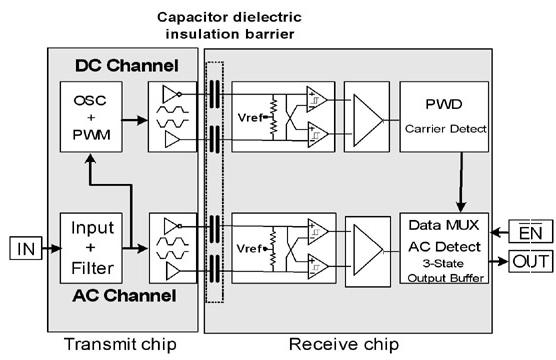 基本AC信道使用輸入信號,并在過濾后透過由隔離電容組成的差分對傳輸該信號。然后,接收芯片上的施密特觸發(fā)器的輸入端對其進行檢測,最后經(jīng)輸出緩沖器輸出該接收到的信號。它可實現(xiàn)非常高速的傳輸、輕微脈寬失真和短傳輸延遲,但不能發(fā)送DC信號。