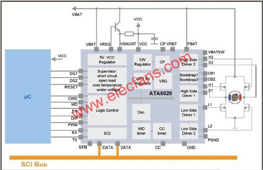 為進(jìn)一步防止系統(tǒng)出現(xiàn)故障,要求汽車IC具備很多功能,如過熱關(guān)閉、過壓和欠壓保護(hù)、以及防短路全保護(hù),要滿足嚴(yán)格的汽車鑒定要求(防傳導(dǎo)干擾,EMC和ESD保護(hù))。為解決這些問題,滿足以上要求,Atmel公司開發(fā)了ATA6026這一高度集成的柵極驅(qū)動(dòng)器IC。該柵極驅(qū)動(dòng)器IC包括一個(gè)5V/100mA穩(wěn)壓器加一個(gè)看門狗,對(duì)要求PCB面積較小的較小型設(shè)計(jì),這就減少了外部元件數(shù),這在機(jī)電方案中很關(guān)鍵。該IC進(jìn)行運(yùn)動(dòng)控制,因此這一功能不需要在微控制器中增加任何存儲(chǔ)器??撮T狗執(zhí)行窗口看門狗的功能,在窗口打開期間,由微控制器通過WD引腳從低電平向高電平轉(zhuǎn)化時(shí)觸發(fā)。如果看門狗檢測(cè)到窗口錯(cuò)誤,即在窗口打開時(shí)未觸發(fā)或者在窗口關(guān)閉時(shí)錯(cuò)誤觸發(fā),將會(huì)產(chǎn)生復(fù)位脈沖。