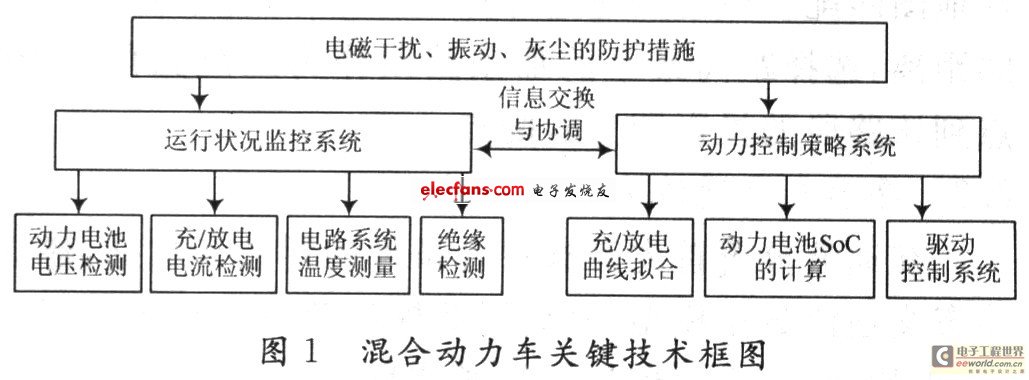 實(shí)現(xiàn)混合動(dòng)力車(chē)共有三個(gè)關(guān)鍵因素:能夠?qū)ζ?chē)運(yùn)行狀態(tài)詳細(xì)監(jiān)控的系統(tǒng);分析監(jiān)控系統(tǒng)所獲取的信息,并發(fā)出相應(yīng)的控制命令;相比一般電子系統(tǒng),混合動(dòng)力車(chē)電子控制系統(tǒng)工作在車(chē)內(nèi)非常惡劣的環(huán)境,電磁干擾、振動(dòng)、灰塵等都會(huì)造成技術(shù)上的瓶頸,如圖1所示。