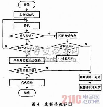 在鎖定狀態(tài),車主要進(jìn)行指紋注冊/刪除或應(yīng)急點(diǎn)火時,接入密碼鑰匙,通過鍵盤操作STM32F103VC在其PA1產(chǎn)生CH376T芯片的SPI片選信號,低電平有效,然后按SPI輸出方式發(fā)出一個字節(jié)的數(shù)據(jù),延時1.5μs,從CH376T接收一個字節(jié)的數(shù)據(jù),等待SPI接口空閑后,MCU繼續(xù)從CH376T接收數(shù)據(jù),直到MCU禁止SPI片選。接下來對讀取的數(shù)據(jù)進(jìn)行密碼匹配,密碼匹配正確時可進(jìn)入設(shè)置狀態(tài),車主可根據(jù)語音和LCD提示進(jìn)行操作,操作結(jié)束便返回鎖定狀態(tài)。如果密碼匹配不正確將發(fā)出相應(yīng)報警信號并切斷電路和油路。如果不進(jìn)行設(shè)置,當(dāng)插入汽車鑰匙并打至“ON”位,可進(jìn)行指紋采集和匹配,匹配正確可自動點(diǎn)火(點(diǎn)火失敗時可用車鑰匙再次點(diǎn)火),如果指紋匹配不正確,發(fā)出相應(yīng)報警并保持電路和油路為斷開狀態(tài)。