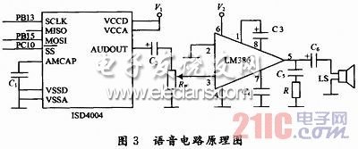 語音電路原理圖如圖3所示,由美國ISD公司的語音芯片ISD4004-16和美國國家半導(dǎo)體公司的音頻功率放大器LM386等元件構(gòu)成。ISD4004 -16錄放時間為16 min(可分段),它采用CMOS技術(shù),單電源3 V工作,內(nèi)含振蕩器、抗混疊濾波器、平滑濾波器、音頻放大器、自動靜噪及高密度多電平閃爍存貯陳列。它內(nèi)置微控制器SPI總線串行通信接口??蓪⒛M語音數(shù)據(jù)直接寫入單個存儲單元,不需通過A/D或D/A轉(zhuǎn)換。使得ISD語音電路具有音質(zhì)自然、使用方便、單片存儲、反復(fù)錄放、低功耗、抗斷電等許多優(yōu)點(diǎn)。LM386工作電壓范圍寬,電壓增益可調(diào)。具有自身功耗低、電壓增益可調(diào)整電源電壓范圍大、外接元件少和總諧波失真小等特點(diǎn)。本設(shè)計中STM32F103VC通過SPI2給ISD4004傳送語音信息。圖3中的V1和V2分別經(jīng)三極管與+3.3 V和+12 V電源相連,三極管的通斷由STM32F103VC的PCI1和PCI2控制,只有在需要語音提示時,才使三極管導(dǎo)通給ISD4004和LM386供電。