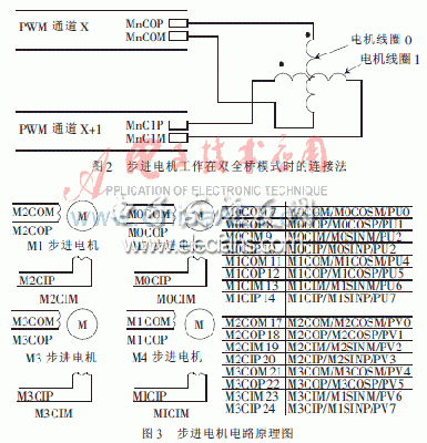 車速表、轉(zhuǎn)速表、油位表和水溫表均由步進電機驅(qū)動。硬件設(shè)計時只需用引線將單片機與步進電機連接即可。圖2為單獨一個步進電機工作在雙全橋模式時的連接方法,它由兩個脈寬調(diào)制(PWM)通道控制,通道X控制線圈0,通道X+1控制線圈1。實際電路的原理圖如圖3所示,M1、M2、M3和M4分別為車速表、轉(zhuǎn)速表、油位表和水溫表。