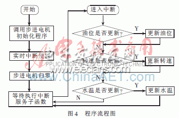 因為油位表、發(fā)動機轉(zhuǎn)速表和水溫表的數(shù)據(jù)都是從CAN總線傳過來的,所以將這三塊表的程序整理到同一個模塊中,轉(zhuǎn)速表和水溫表的函數(shù)功能與油位表相同。程序流程圖如圖4所示。
