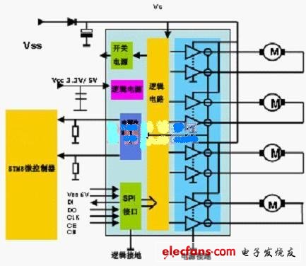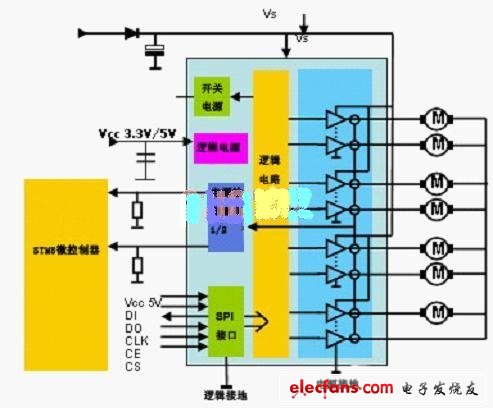 在這兩款產(chǎn)品中,L99MD01的功能和技術(shù)比較復(fù)雜,主要用于高端的汽車市場(chǎng);該芯片整合了8個(gè)半橋電路,能夠同時(shí)驅(qū)動(dòng)4個(gè)直流電機(jī)或依次驅(qū)動(dòng)7臺(tái)直流電機(jī),如圖3和圖4所示。