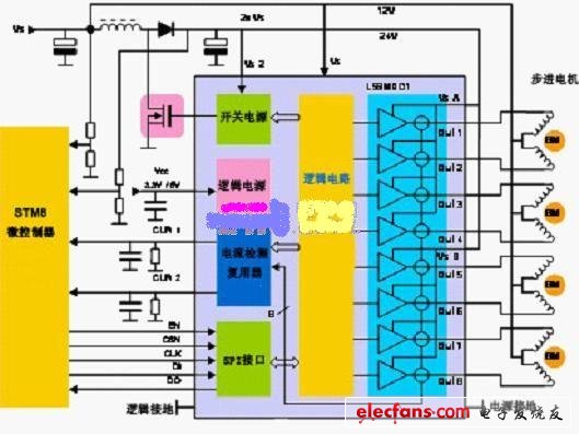 當(dāng)被用作步進(jìn)電機(jī)驅(qū)動(dòng)器時(shí),通過(guò)內(nèi)置的開關(guān)式電源模塊,配合外部升壓轉(zhuǎn)換器,這款芯片能夠同時(shí)驅(qū)動(dòng)4臺(tái)步進(jìn)電機(jī),或者依次驅(qū)動(dòng)3臺(tái)步進(jìn)電機(jī)。