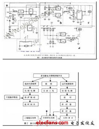 多功能電子搭鐵控制開關(guān)主要由四大部分組成:a )起動(dòng)失控控制電路;b)電磁式繼電器;c ) IC集成自動(dòng)斷電電路;d)三端穩(wěn)壓電路,其電路見圖1,各部分的邏輯結(jié)構(gòu)見圖2。