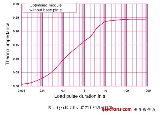 對于運(yùn)行中逆變器的實(shí)際熱負(fù)載,時(shí)變負(fù)載必須加以考慮?;旌蟿恿螂妱悠噷?shí)際運(yùn)行過程中,出現(xiàn)不同的負(fù)載狀態(tài):車輛加速過程中,igbt處于特別高的負(fù)載下,而減速過程中,進(jìn)行能量回收,電機(jī)的電池重新充電,這時(shí)續(xù)流二極管處于最大負(fù)載下。為了描述逆變器模塊的時(shí)變升溫,也必須研究功率模塊在0.1s~30s負(fù)載循環(huán)下的行為。對于兩種配置,igbt的時(shí)變熱阻都按照負(fù)載脈沖的寬度增加,如圖4所示。熱量開始從功率半導(dǎo)體沿著散熱器的方向流動、擴(kuò)散,導(dǎo)致整個(gè)模塊升溫。如果負(fù)載脈沖持續(xù)時(shí)間超過30s,模塊將被充分加熱,熱阻不再增加。