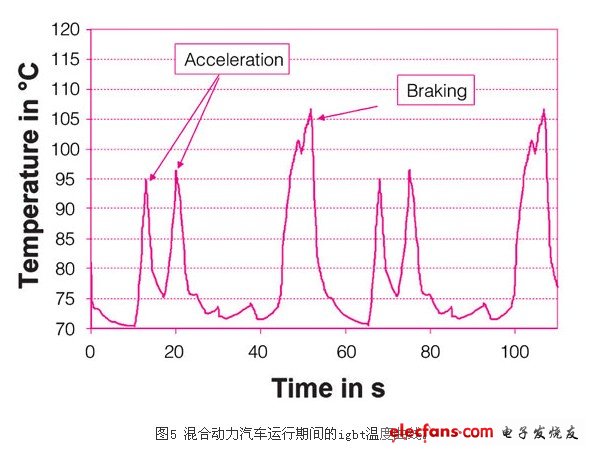 時(shí)變熱阻值現(xiàn)在可用來計(jì)算運(yùn)行過程中半導(dǎo)體開關(guān)和閥上的熱負(fù)載。要做到這一點(diǎn),現(xiàn)實(shí)的負(fù)載周期,正如實(shí)際應(yīng)用中會出現(xiàn)的那樣,被用來模擬典型負(fù)載狀態(tài)和負(fù)載脈沖寬度。讓我們以混合動力汽車驅(qū)動周期為例,如圖5所示。在最初的啟動和加速階段,能量來自電池并送入電機(jī)。在這些加速度階段,輸出功率可達(dá)到60kw。igbt的溫度按照逆變器的輸出升高到95℃。在恒速階段只需很少的逆變功率,半導(dǎo)體的溫度再次下降。在減速階段,目標(biāo)盡可能多地回收能量并反饋給電池。此時(shí),igbt和二極管的功耗大致相同,而熱量耗散正處于最高值,igbt的溫度達(dá)到近110℃。