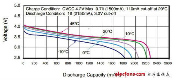 圖2:在給定溫度和放電電流值條件下,像松下CGR18650CG這樣的鋰離子電池在放電范圍的中間部分具有接近平坦的輸出電壓。這對能源來說是一種優(yōu)勢,但對需要精確測量荷電狀態(tài)(SOC)的工程師來說增加了設計復雜性。(松下公司提供)
