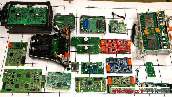 圖1:雪佛蘭Volt電池管理系統(tǒng)將所有功能劃分為用多塊PCB實現(xiàn)的多個子系統(tǒng)。這次拆解的重點是電池接口控制模塊——上圖從右數(shù)第2欄中的紅色、藍色和綠色電路板。(UBM TechInsights提供)