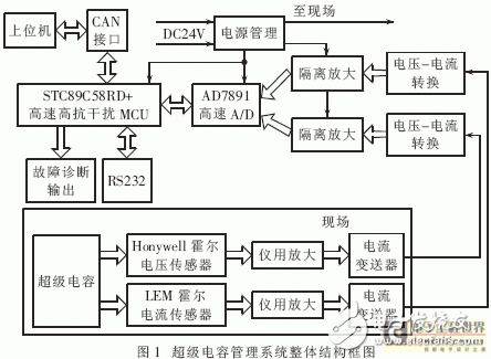 4 強(qiáng)烈的電磁干擾,為電容組件的檢測帶來很大的困難。同時由于串聯(lián)超級電容往往采用大電流充放電(通常在50A~150A之間),電壓、電流變化十分迅速,這樣迅速的充放電速度和幅度帶來的噪音影響也是十分巨大。因此針對超級電容特殊的工作狀況,本文給出了一種利用單片機(jī)設(shè)計(jì)的超級電容電池測試系統(tǒng)方案。