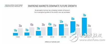 新興市場將主導(dǎo)未來汽車銷量增長:隨著人均收入增加,新興市場在全球新車購買中所占比重日益增加。 1995 年時,新興市場汽車銷量為 1400 萬輛,而發(fā)達國家市場汽車銷量超過 3500 萬輛。