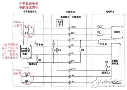14706 連接,并且在專用供電設備上安裝了控制導引裝置,專用供電設備即交流充電樁;模式四將電動汽車連接交流電網或直流電網時,使用了帶控制導引功能的直流供電設備,即直流充電樁。在這里,我們主要討論模式三、模式四充電樁內