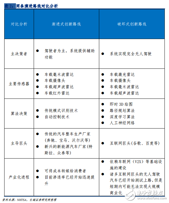 傳統(tǒng)汽車廠商更趨向于通過技術(shù)的不斷積累,場(chǎng)景的不斷豐富,逐步從輔助駕駛過渡到半自動(dòng)駕駛,進(jìn)而在將來(lái)最終實(shí)現(xiàn)無(wú)人駕駛;某些高科技公司則希望通過各種外部傳感器實(shí)時(shí)采集海量數(shù)據(jù),處理器經(jīng)過數(shù)據(jù)分析然后