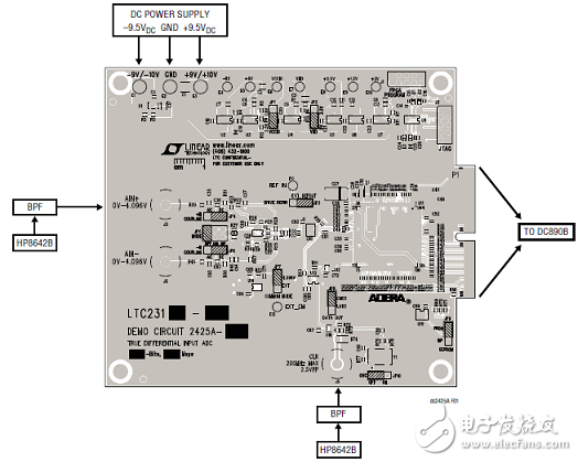 9 演示電路2425A采用LTC?2311系列。這些差分、單通道、16位、串行高速逐次逼近寄存器(SAR) ADC具有高達5Msps的采樣速率,采用16引腳MSOP封裝。LTC2311系列具有最大