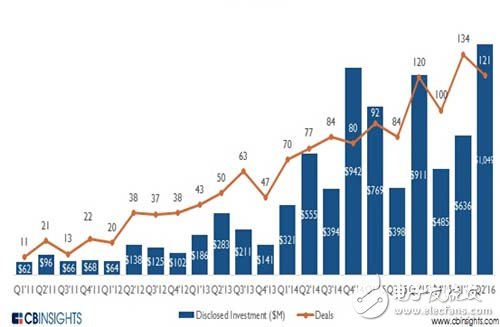 在創(chuàng)投圈里錢(qián)難拿的當(dāng)下,人工智能領(lǐng)域依舊是一派熱鬧的景象。美國(guó)風(fēng)投數(shù)據(jù)機(jī)構(gòu)CB Insights就人工智能產(chǎn)業(yè)的投融資情況發(fā)布的一組數(shù)據(jù)報(bào)告顯示, 2016年第二季度里,盡管人工智能相關(guān)項(xiàng)目交易量下滑了10%,但交易金額卻達(dá)到了歷史最高水平(見(jiàn)下圖)。