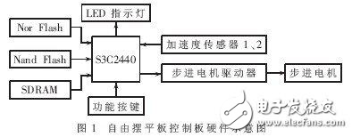 本自由擺平板控制板采用S3C2440作為主控芯片,外接NorFlashAM29LV160DB、NandFlashK9F1208及兩塊SDRAMHY57V561620構(gòu)成嵌入式最小系統(tǒng)。NorFlash和NandFlash同時(shí)存在的好處在于NorFlash中存放BootLoader完成系統(tǒng)調(diào)試及NandFlash中程序的燒寫,方便調(diào)試。系統(tǒng)設(shè)計(jì)了5個(gè)功能按鍵分別接到S3C24405個(gè)外部中斷引腳(EINT8、11、13、14、15),另外接5個(gè)LED(GPH9、GPH10、GPF6、GPG1、GPB1)作為各類狀態(tài)的指示信號(hào)。通過S3C24406個(gè)普通I/O口模擬兩路IIC接口(GPF0~GPF5)分別接加速度傳感器1、2。4個(gè)I/O(GPE11、12、13、GPG2)口接步進(jìn)電機(jī)驅(qū)動(dòng)器。如圖1所示。