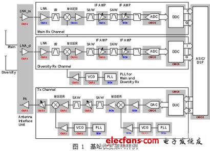 在蜂窩基站中,數(shù)字電子技術(shù)執(zhí)行許多復(fù)雜的功能,通常在軟件與固件控制下工作。而收發(fā)信號則需要模擬電子技術(shù)。數(shù)據(jù)轉(zhuǎn)換器用于將信號從一個領(lǐng)域轉(zhuǎn)換到另一個領(lǐng)域,即從數(shù)字轉(zhuǎn)換為模擬并從模擬轉(zhuǎn)換回數(shù)字。圖1顯示了發(fā)送(Tx)與接收(Rx)架構(gòu)以及目前常用的相關(guān)半導(dǎo)體工藝。
