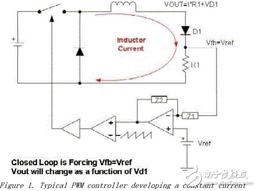 The traditional way to control the output of multiple LEDs is to dedicate a pulse width modulation (PWM) controller to each LED and use the controller to transform the input voltage to a current that supplies the LED. Often voltage controlled PWM controllers are used for this purpose. A current sense resistor is placed in series with the LED that feeds a voltage back to the controller. In essence, the controller is operating in a voltage mode holding the sample voltage constant, thereby, maintaining a constant current. This typical arrangement is shown in Figure 1.