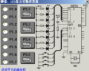 能感受到真實(shí)的學(xué)習(xí)環(huán)境,降低單片機(jī)的入門門檻。圖1 是鍵盤、LED 顯示實(shí)驗(yàn)仿真板的圖,從圖中可以看出,該板比較簡(jiǎn)單,有在P1 口接有8 個(gè)發(fā)光二極管,在P3 口接有4 個(gè)按鈕,圖的右邊給出了原理圖。