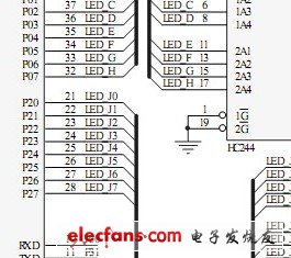 選用MCS51 系列AT89S51 單片機(jī)作為微控制器,選擇兩個(gè)四聯(lián)的共陰極數(shù)碼管組成 8位顯示模塊,由于 AT89S51 單片機(jī)驅(qū)動(dòng)能力有限,采用兩片 74HC244 實(shí)現(xiàn)總線的驅(qū)動(dòng),一個(gè) 74HC244完成共陰極數(shù)碼管位控線的控制和驅(qū)動(dòng),另一個(gè) 74HC244完成數(shù)碼管的 7 段碼輸出,在 7段碼輸出口上各串聯(lián)一個(gè) 100 歐姆的電阻對(duì) 7 段數(shù)碼管限流。用 P3口的 P3.0-P3.5完成發(fā)光二極管的控制,實(shí)現(xiàn)交通燈信號(hào)的顯示, 每個(gè)發(fā)光二極管串聯(lián) 500歐姆電阻起限流作用。 硬件電路原理圖如圖所示。