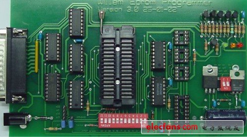 ??? 這里介紹的一款多功能編程器,功能強(qiáng)大,支持大多數(shù)常用的EPROM, EEPROM, FLASH, I2C,PIC, MCS-51,AVR, 93Cxx等系列芯片(超過400種)。硬件成本較低,性價(jià)比很高。既適合于電子和電腦愛好者使用,也適合家電維修人員維修家電和單片機(jī)開發(fā)人員使用。圖1為多功能編程器的主機(jī),中間是32腳ZIF(零插力)鎖緊插座, 用于27系列、28系列、29系列、39/49系列等BIOS芯片。左邊是25芯并口插座,通過并口電纜連接計(jì)算機(jī)并口。左下方是電源插座。32腳ZIF插座下方是12位的DIP開關(guān),對(duì)EPROM芯片進(jìn)行讀寫等操作前,需將此開關(guān)撥至相應(yīng)位置。具體開關(guān)位置可以參照軟件提示。