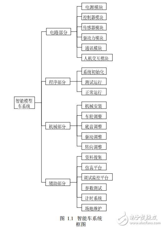 在歷時近半年的智能車的準(zhǔn)備過程中,我們經(jīng)過多次嘗試和實(shí)驗(yàn)以及理論分析,最終確定了使用 MS9S12XS128 作為智能車核心處理芯片,同時使用數(shù)字?jǐn)z像頭 OV5017 作為圖像傳感器對道路進(jìn)行識別,并在電路、機(jī)械等方面實(shí)現(xiàn)創(chuàng)新,最終成功實(shí)現(xiàn)了基于數(shù)字?jǐn)z像頭圖像采集系統(tǒng),并確定了適當(dāng)?shù)臄z像頭視野以及合理的控制算法,使智能車在高速運(yùn)行的狀態(tài)下能夠平穩(wěn)、順利的完成比賽。 1.2 智能車系統(tǒng)框架圖智能車系統(tǒng)在大方向上主要分為四部分:電路部分、程序部分、機(jī)械結(jié)構(gòu) 部分、輔助部分。智能車系統(tǒng)結(jié)構(gòu)框如圖1.1所示: