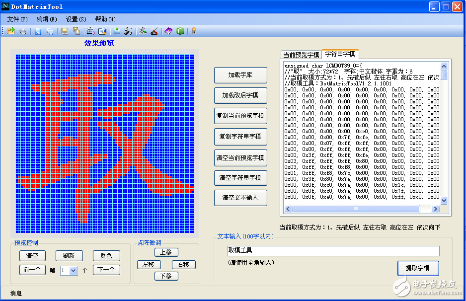 DotMatrixToolV1.2.2.1 是一款專業(yè)的顯示器件取模的一款專用軟件 本版本,采用字庫(kù)與軟件分離存放,需要什么字體,就調(diào)用什么樣的字庫(kù)。 1、LED點(diǎn)陣屏取模; 2、液晶取模,如常用的LCD12864、LCD12832、LCD24064、LCD320240等; 3、TFT彩色液晶屏取模本軟件支持支持十二種大小字模取模: 12點(diǎn) 16點(diǎn) 24點(diǎn) 32點(diǎn) 40點(diǎn) 48點(diǎn) 56點(diǎn) 64點(diǎn) 72點(diǎn) 80點(diǎn) 88點(diǎn) 96點(diǎn)等; 支持十六種取模方式; 支持將字模文件保存為.c 或.h形式;
