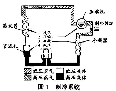該車空調(diào)系統(tǒng)的工作原理如圖1所示。當(dāng)空調(diào)系統(tǒng)打開時,壓縮機(jī)壓縮制冷荊成為熱高壓蒸氣,熱高壓蒸氣離開壓縮機(jī)后通過軟管和金屬管流向發(fā)動機(jī)冷卻系散熱器前面的冷凝器。當(dāng)制冷劑經(jīng)冷凝器向下流時,通過冷凝器的空氣流使高壓蒸氣得到足夠的冷卻.使之冷凝成液體。